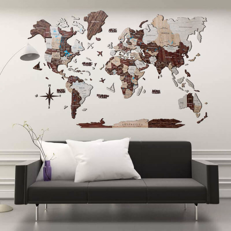 Wooden wall map | 3D Cappuccino is nice to the touch and will delight your eyes for years to come. The map creates a 3D effect due to its unique raised areas from 6 mm to 12 mm.