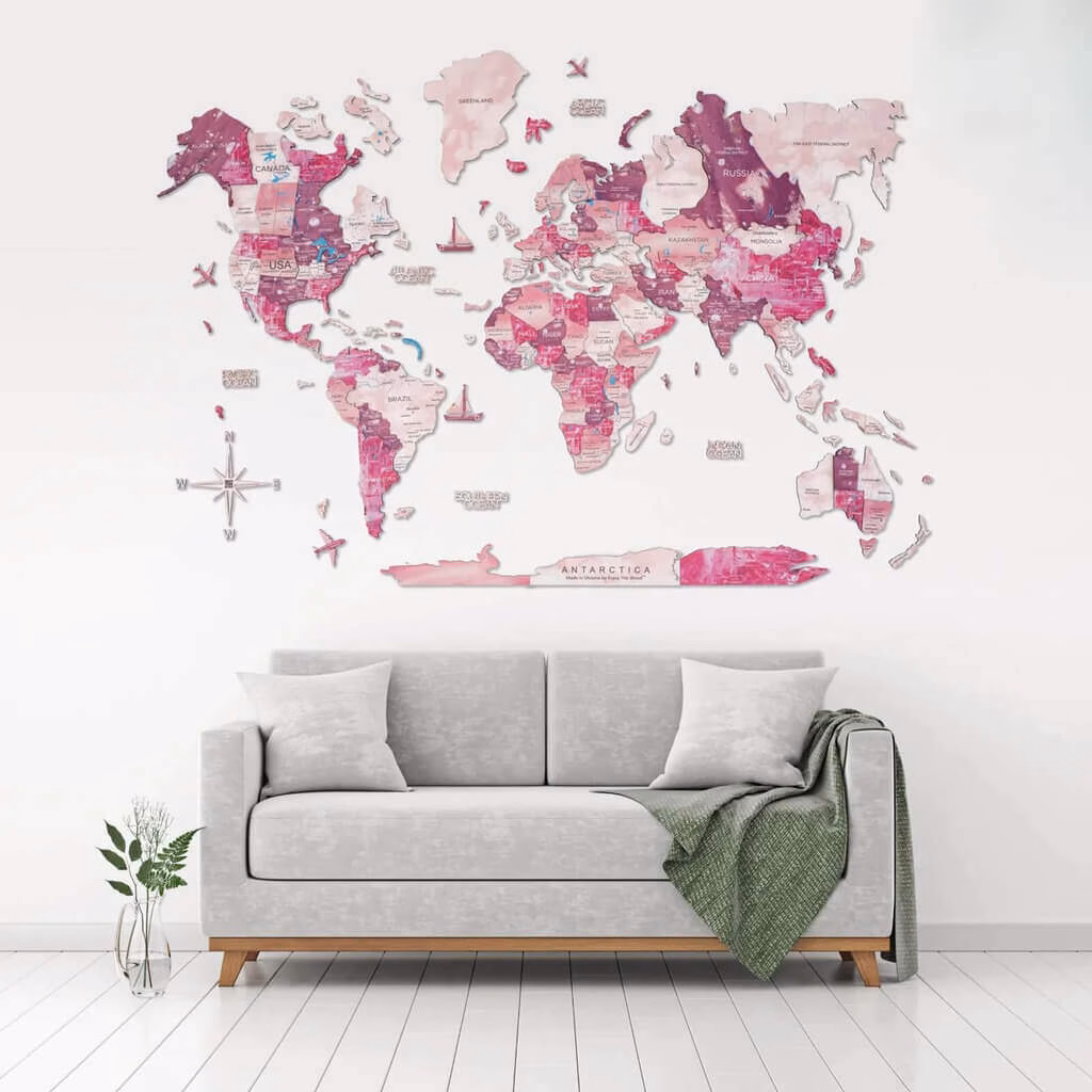 The wooden wall map “3D Dream” washes the room in soft rose and blush tones, while a layered 6–12 mm relief makes coastlines and borders easy to read. Precision-cut fiberwood with a low-glare matte finish creates warm, modern wall decor for bedrooms, studios, or offices. Quick, clean installation.