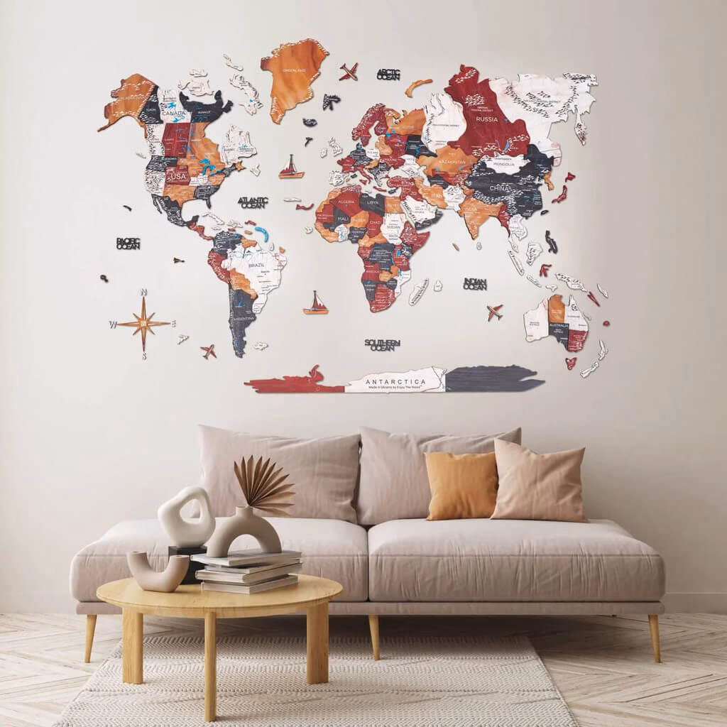 The colored Wooden Wall maps are stylish, cozy, original, and made from high-quality fiberwood.