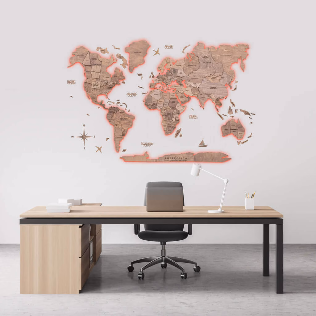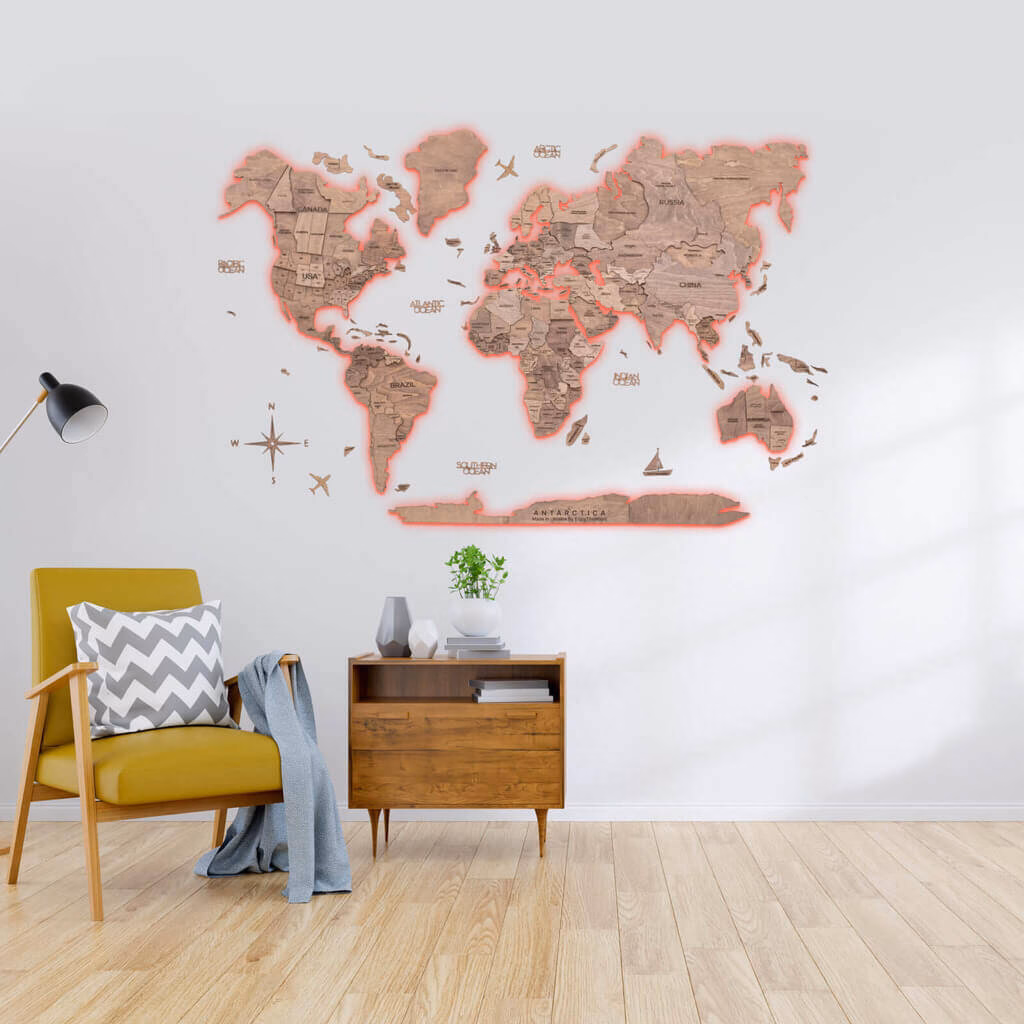 Discover a 3D Wooden Wall Map adorned with vivid colors and interactive LED backlights. These captivating lights react to your voice, music, and the colors detected by your camera! Installation is both simple and enjoyable.