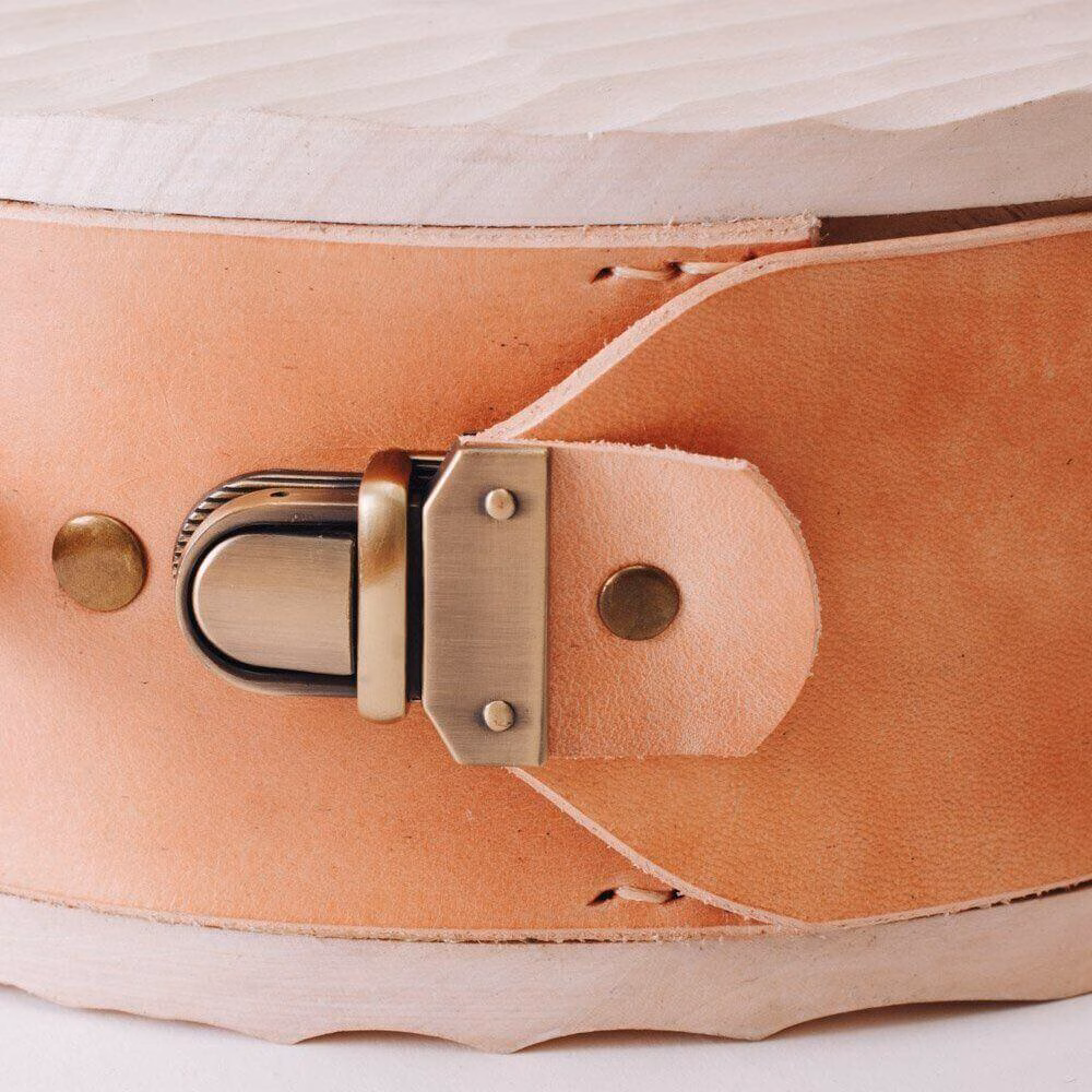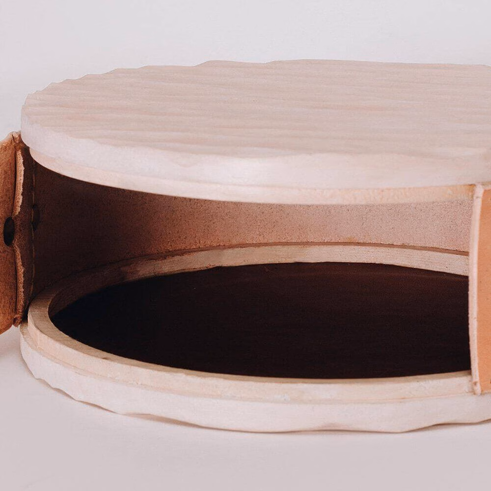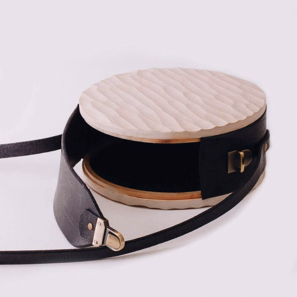 Puidust külgedega ümmargune nahkkott