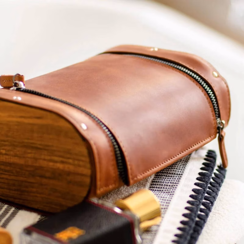 Stiilne Tualett-tarvete kott puidust sisenditega on kasulik reisimisel ja mitte ainult.