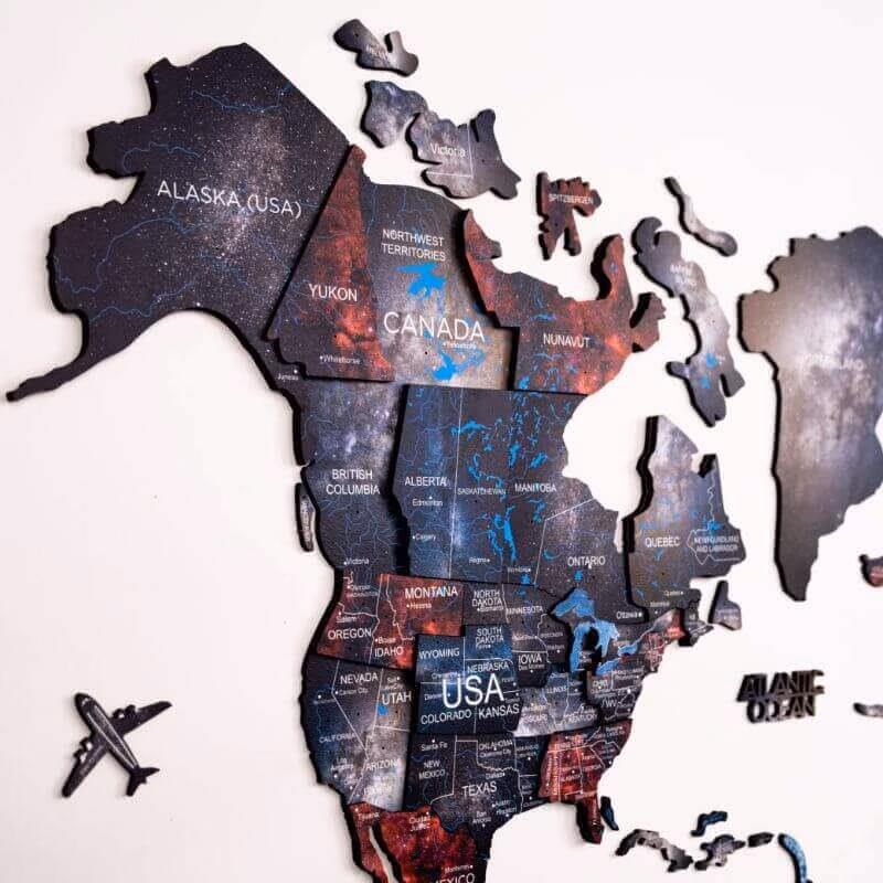 Puidust maailma seinakaart | 3D Alcor on tehtud kvaliteetsest kiudpuidust, pind on käega katsudes mõnus ning pakub Teile silmailu aastateks. Kaardil on loodud 3D-efekt tänu mitmekihilisele vineerile, mille kõrgus on vahemikus 6 mm kuni 12 mm.
