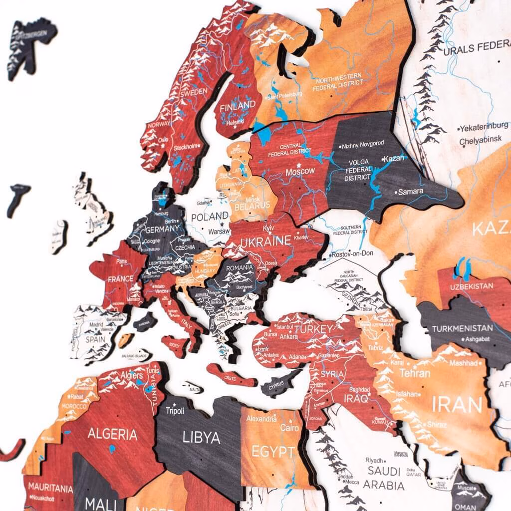 Puidust maailma seinakaart | 3D Onyx on tehtud kvaliteetsest kiudpuidust, pind on käega katsudes mõnus ning pakub Teile silmailu aastateks. Kaardil on loodud 3D-efekt tänu mitmekihilisele vineerile, mille kõrgus on vahemikus 6 mm kuni 12 mm.