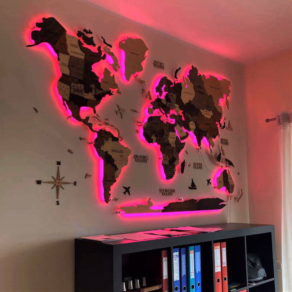 Деревянная карта мира на стену | 3D LED & Акрил может быть как без подсветки, только на акриле, так и с подсветкой. Указать данную опцию можно выше, при выборе размера и версии.