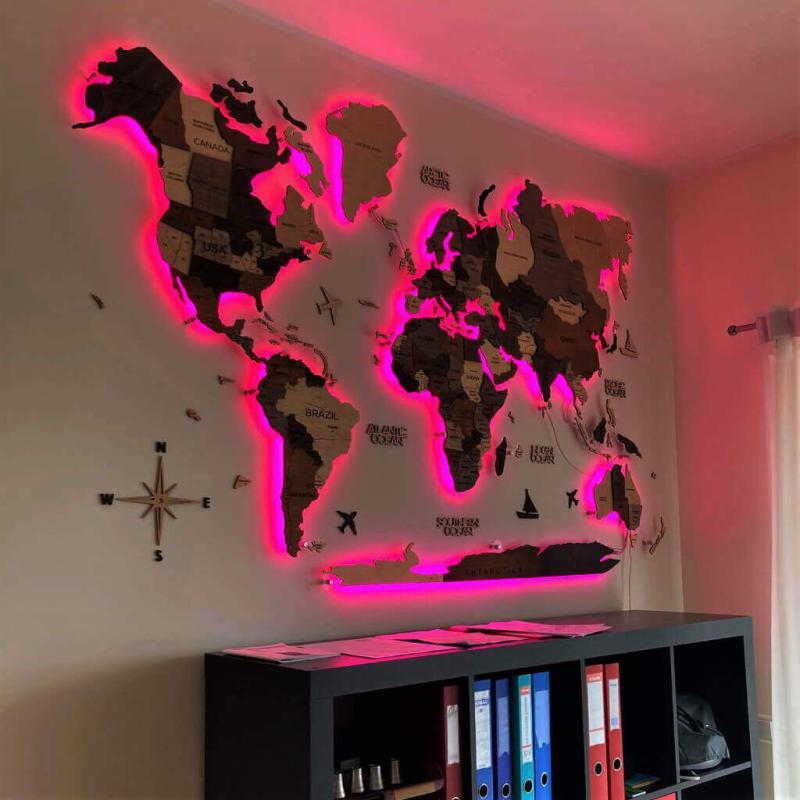 Деревянная карта мира на стену | 3D LED & Акрил может быть как без подсветки, только на акриле, так и с подсветкой. Указать данную опцию можно выше, при выборе размера и версии.